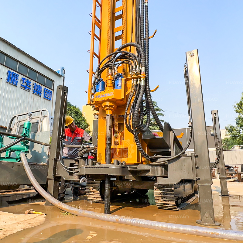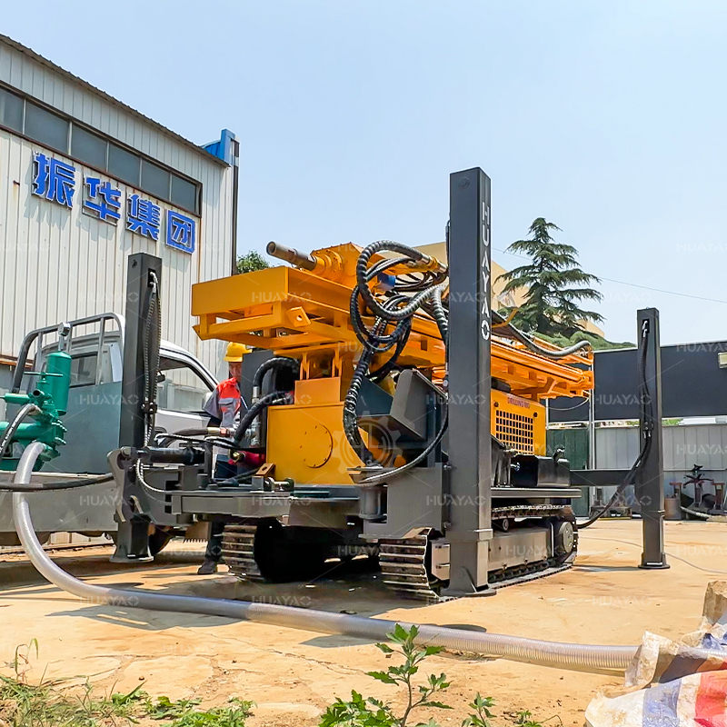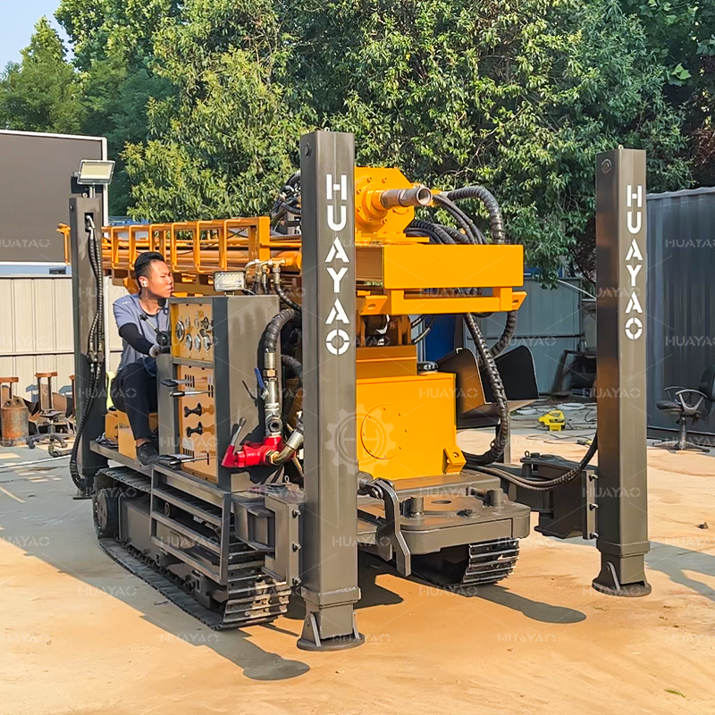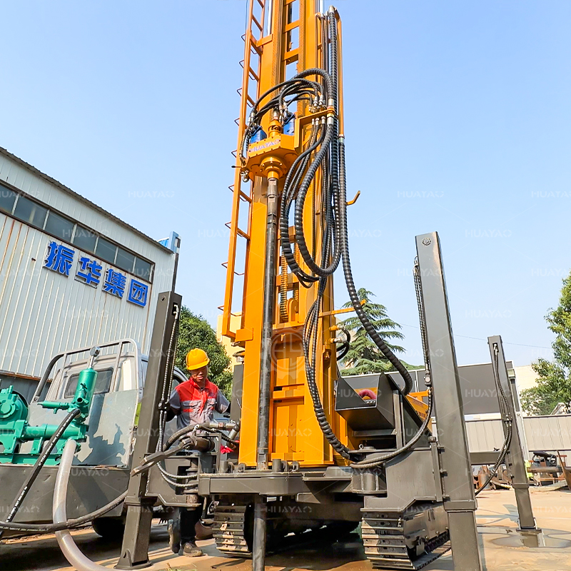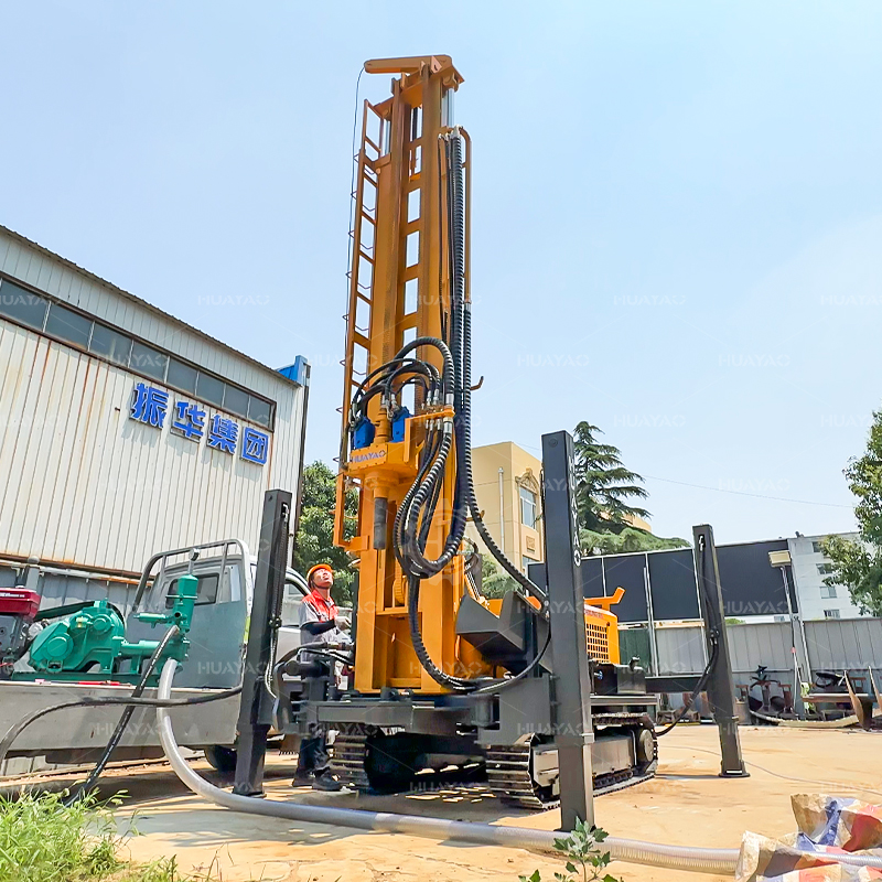 产品描述: 华耀水井钻机是一种轻型、高效、多功能的钻井设备,主要适用于工业、民用、地热钻井。 气动钻机具有以下优点结构紧凑,快速钻井,灵活的运动,以及广泛的应用领域。特别适合从山区和岩层取水。 HY200可用于不同地层,钻孔直径可达130-400mm。 HY200采用新的液压技术,配备大扭矩液压马达旋转和大缸径液压缸推进。 名牌常柴78千瓦四缸发动机为液压系统提供动力。 液压泵组的独特设计,便于维护,降低了维护成本。 HY300采用工程专用橡胶履带,行驶中不会损伤路面。 液压操作杆和仪表板居中布置在机器右侧,便于操作,提高了机器的运行效率。 带15个的提升机T提升力可以轻松提升钻杆和冲击器。 运输规模为3.8m * 1.7*2.3m长,且体积小,便于钻机的运输。
