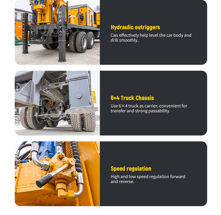 :HYC-500车载钻机主要用于精细作业和硬岩层。主要用途是进行井灌和水文地质勘探,用于农业灌溉、工业用水钻孔、水井地下隧道通风。水井钻机配备有可微调的钻井机构和机械卸载钻井工具。配备空气压缩机、泥浆泵、钻杆、钻头和安装在一辆车上的钻机。